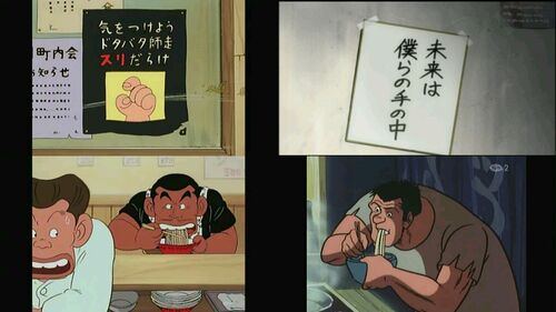 (Togetterのバックアップです。修正や追加などで再構成しています。) 冒頭、スリ注意を促す貼り紙が風ではためき、特徴である紙=キャラが出ている。伏線にもなっている。また、テツがカルメラ経営のラーメン屋でラーメンを食べており、特徴の飯テロ。 画像…
